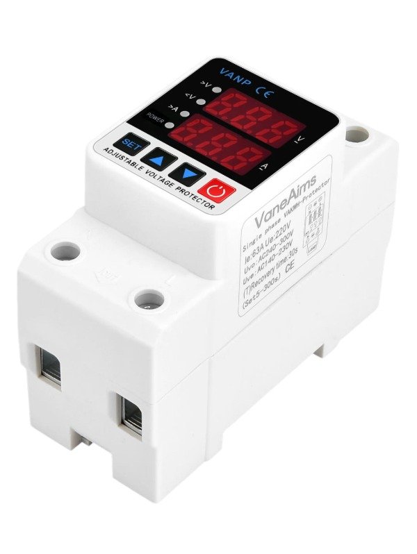 Protector de tensión monofásico digital de 63A para montaje en riel DIN.